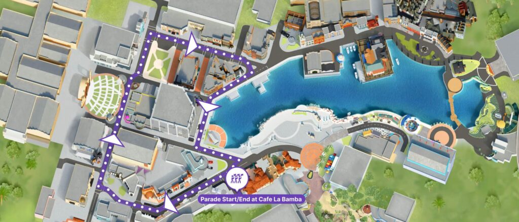 Here is the newly released parade route! It begins and ends at Cafe La Bamba, and will work it’s way through Hollywood and New York. There are several places you can get great views, including in front of the Wicked Experience, the steps in front of The Tonight Show Ride Starring Jimmy Fallon, and the alcove next to the lagoon across from Mel’s Drive-In!